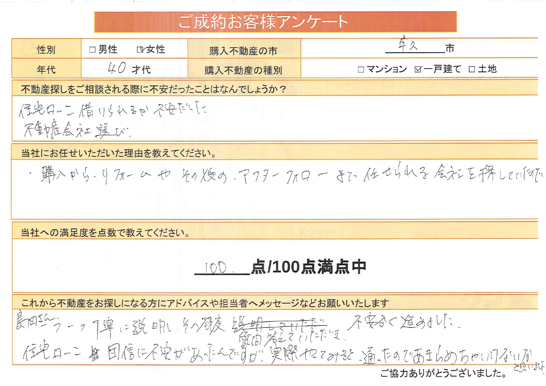 「島田さんが1つ1つ丁寧に説明してくださり、その都度、質問に答えていただき、不安なく進められました。住宅ローン団信に不安があったんですが、実際やってみると通ったので諦めちゃいけないなと思いました。」