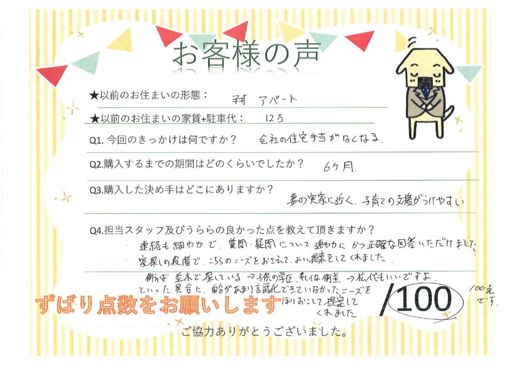 「連絡も細やかで、質問疑問について速やかに かつ正確な回答いただけました。家探しの段階で、こちらのニーズをおさえて、よい提案をしてくれました。」