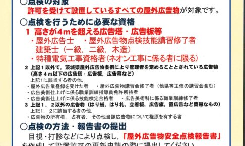 皆様、こんにちは! 営業2課の吉田です。 ビル所有のオーナー様! 屋外看板を設置している地主様! 点検ルールが改正になります! 『令和3年10月1日から』許可更新の際に 有資格者による点検と報告書提出が必要になります。 …