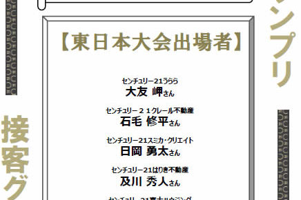 本日、接客グランプリ本選が開催されてセンチュリー21本部に弊社の大友の運転手として東京の外苑前に行きました。 昨年は、この本選に2名参加させていただき当社の最年長営業マン佐藤が見事「東日本代表」に選ばれました。 通常の業…
