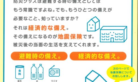 皆様、こんにちは! 営業2課の吉田です。 2週に続き地震保険のお話です! 地震保険の話に移る前に備えの確認です。 1.避難時の備え 2.経済的な備え 1.の避難時の備えは防災グッズです。 災害時に慌てずに取り出せる場所に…