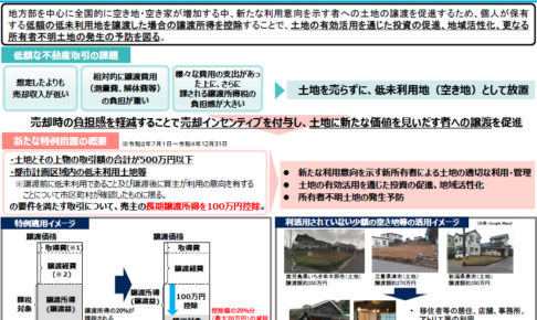 低未利用土地等を譲渡した場合の長期譲渡所得の特別控除とは、活用されていない土地( 市区町村長の確認が必要 )を売却した場合には、100万円の特別控除をするという制度です。2020年7月1日から施行されました。 人口減少が…