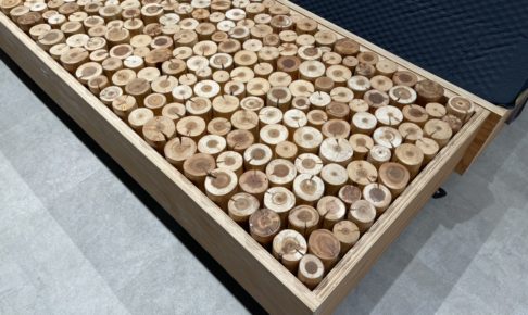 写真は、アウトドアショップのディスプレイです。 ベッドのような四角い箱に輪切りにされた木が敷き詰められています。こんな木の使い方は、斬新で面白いなと思います。